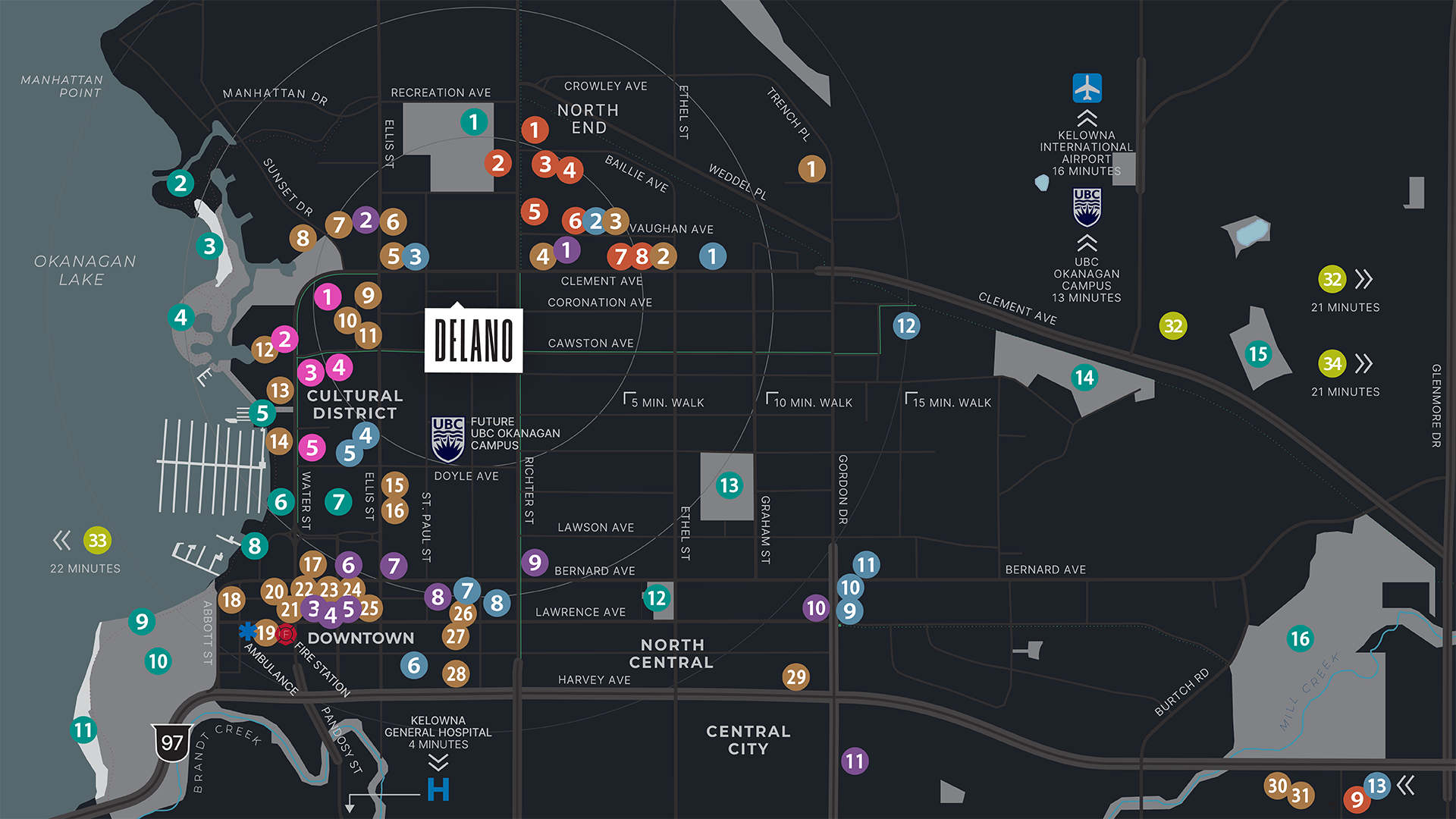 Delano is surrounded by a plethora of shops, restaurants, beaches, parks, and more. It’s also minutes from UBCO’s upcoming downtown campus. Dive into Kelowna’s vibrant art and cultural scene. Explore an emerging urban neighborhood nearby bursting with chic charm and lively entertainment.